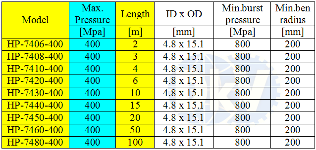 - Cấu hình của ống dây thủy lực nylon HP-7430-400: Vật liệu: nilon gia cường (Thermo plastic). Chiều dài: 10 m. Đầu ren ống: G1/4″ và M16 x 1.5. Đường kính trong của ống: 4.8 mm. Hoạt động ở áp: 4.000 bar (400 MPa). Áp phát nổ: 8.000 bar (800 MPa), đường kính uốn cong nhỏ nhất chịu được: 200 mm.